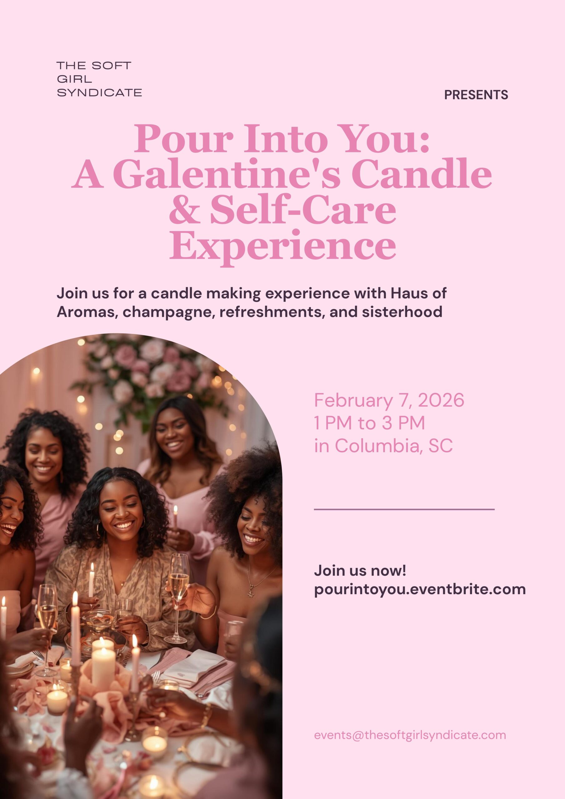 A luxury Galentine's self-care experience with candle-making, champagne, and connection. Come as you are, leave glowing.This Galentine's season, it's your turn to pour back into you.Join The Soft Girl Syndicate for Pour Into You, an intimate, self-care event designed for women who are ready to slow down, reconnect, and celebrate softness together.Hosted in a cozy,